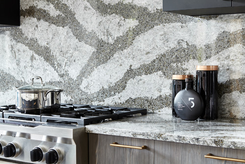 2. This bold quartz backsplash is a continuation of the counter-top itself.